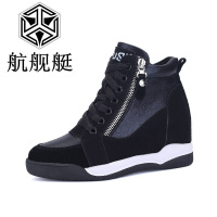 2017秋款欧美高帮鞋运动平底隐形内增高7cm女鞋拼色休闲系带侧拉链女鞋