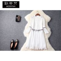 默蒂梵2017春季女装新款圆领流苏吊坠蕾丝拼接荷叶修身百褶连衣裙