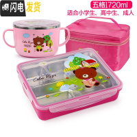 三维工匠韩国304不锈钢五格餐盘学生饭盒儿童便当盒食堂分格保温便携带盖 五格粉卡1720+碗+袋