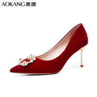 SUNTEK软底2023秋季新款网红鞋绸缎细跟单鞋女方扣水钻高跟鞋红色婚鞋子