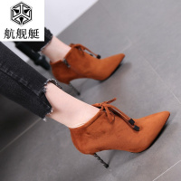 尖头短靴女蝴蝶结绑带细跟高跟鞋2017秋冬新款马丁靴中高跟女踝靴