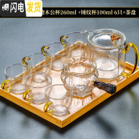 三维工匠透明玻璃功夫茶具套装家用小套红茶泡茶杯简约办 锤纹黄把壶600+锤纹把杯6只+檀木公杯+茶漏+滤水茶盘 9件