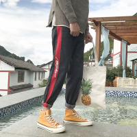2017秋装个性潮牌撞色刺绣字母男士牛仔裤青少年百搭小脚长裤深灰色
