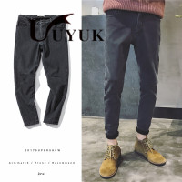 UYUK牛仔裤男2017冬季新品加绒加厚牛仔小脚裤潮流字母印花划破设计加绒牛仔裤男深灰色