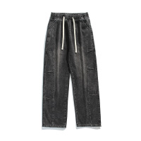 YANXU高街美式水洗做旧渐变色牛仔裤男款宽松直筒抽绳松紧腰阔腿长裤子