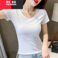 YIBUSHENG圆领短袖修身白色t恤女2024新款显瘦v领黑色紧身薄款上衣肩宽