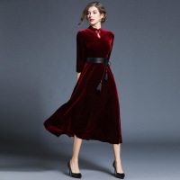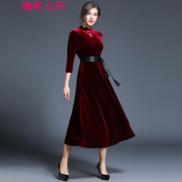 锦铭七玥跨境2018新款欧美红色中长过膝加绒打底显瘦金丝绒旗袍连衣裙