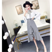 薇侣2017新品初秋新款甜美蝴蝶结开口袖上衣+不规则荷叶边格子裙