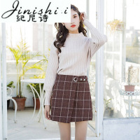 纪尼诗女装2018新款百搭宽松毛衣套头毛衣格子裙A字裙两件套黄色+藏青杏色+咖色