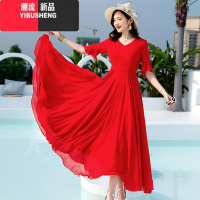 YIBUSHENG连衣裙女装度假纯色五分袖新款长裙过膝沙滩裙大码季V领大摆裙