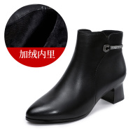 年秋冬新款羊皮靴子女时装靴加绒真皮尖头短靴粗高跟水钻皮靴