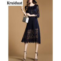 Kruidvat 2017春装新款女装通勤七分喇叭袖蕾丝连衣裙褶皱中长裙 藏蓝色 均码