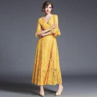 女装2017新款蕾丝裹身长裙时尚v领喇叭袖修身连衣裙