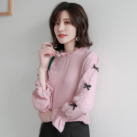 2018春季韩版蕾丝拼接雪纺衬衫女长袖立领喇叭袖衬衣蝴蝶结上衣