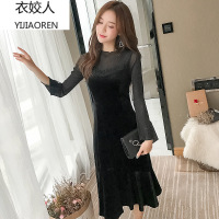 衣姣人(YIJIAOREN) 2018女装赫本小黑裙蕾丝拼接丝绒高腰连衣裙长袖女加厚喇叭袖打底裙内搭
