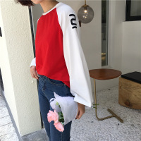 薇侣2017新品港风拼接撞色喇叭袖长袖宽松t恤薄款卫衣