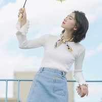 早秋女装新款2017韩版纯白百搭修身甜美套头毛衣喇叭袖上衣针织衫