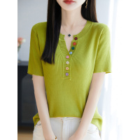 法式设计感冰丝彩扣针织短袖T恤女夏季新款显瘦百搭坑条打底上衣