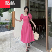 YIBUSHENG通勤方领泡泡袖显白长裙2024年季新款高腰显瘦度假连衣裙6947