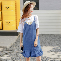 锦铭七玥新款牛仔背带裙宽松腰连衣裙中长款牛仔裙大码韩版长裙破洞