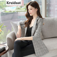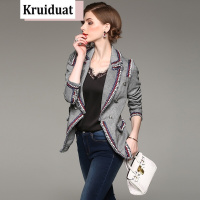 奈琴尔2017秋新款韩版女装时尚格子修身百搭小西装外套女一件 灰色 XXL