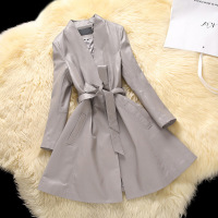 奈琴尔2017秋装新款气质女装欧美西装领长袖修身中长款外套上衣灰色
