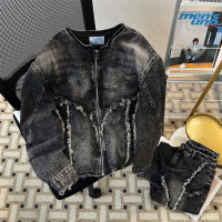 套装男新款美式水洗做旧牛仔夹克套装时尚毛边微喇牛仔裤潮流夹克