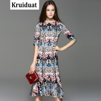 Kruidvat2017早春新款优雅气质七分袖过膝印花宽松鱼尾裙女