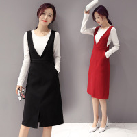 莞馨(wanxin)新款2016新款秋装韩版背带裙女中长款时尚毛呢连衣裙两件套开叉中长裙