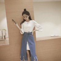 秋季韩版新款中长款七分袖T恤裙开叉毛边牛仔裙两件套时尚套装女