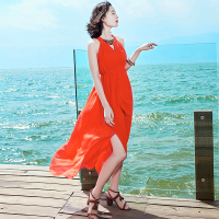 夏季新品女装裙子波西米亚长裙无袖雪纺连衣裙海边度假沙滩裙串珠开叉裙