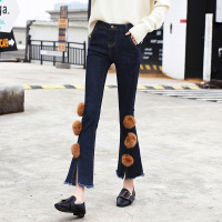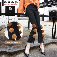 珂依舍2017冬装新款秋冬新款毛边弹力牛仔喇叭裤女兔绒拼接修身九分微喇裤