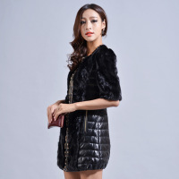 秋冬新款女式兔毛皮外套 中长款优雅修身拼接真皮皮衣