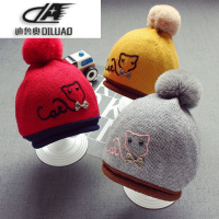 秋冬3个月-2岁宝宝儿童加厚毛线帽子韩版猫咪毛球帽子刺绣套头帽