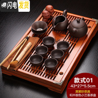 三维工匠功夫茶具套装简约整套实木茶盘陶瓷紫砂冰裂茶壶茶杯茶海家用 棕色小兰香黑紫砂 15件