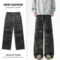 微喇迷彩牛仔裤子男女同款款工装休闲裤松紧腰男装宽松垂感拖地裤