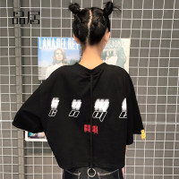 夏季原宿风飘带短袖短款T恤女韩版潮宽松学生肚脐上衣服