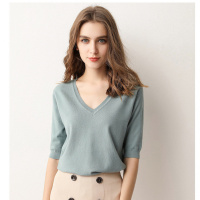 春夏季五分袖针织衫女v领短款套头短袖薄款打底衫羊毛宽松中袖