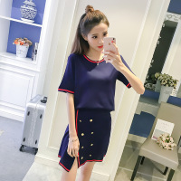 薇侣2017新品7拼色条纹冰丝针织衫套装女开叉性感半身裙两件套
