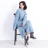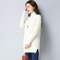 冬季新款女式针织衫休闲纯色不规则开叉立领中长款毛衣女