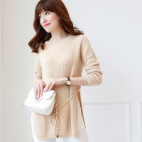 中长款开叉系带针织衫女套头秋冬款新款韩版女装圆领宽松打底衫