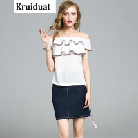 Kruidvat2017夏季新款欧美休闲女装一字肩T恤+牛仔半身裙时尚套装女白色