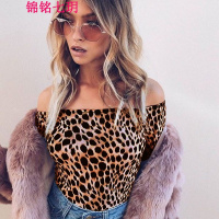 锦铭七玥欧洲站2017秋女装热销豹纹一字领长袖女士T恤