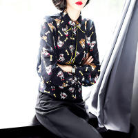 欧洲站2018春季新款女装狗狗印花衬衫长袖真丝衬衣系带上衣