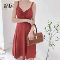 春季新款复古港味设计肩带可调节收腰抽褶连衣裙吊带女中长款