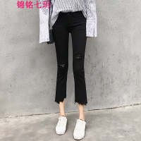 锦铭七玥2018春夏韩版破洞喇叭裤港味九分裤弹力显瘦黑色牛仔裤 101