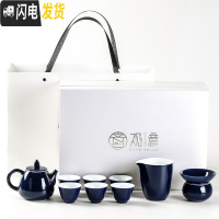 三维工匠霁蓝家用小6人简约现代茶具套装创意陶瓷功夫喝茶杯整套 霁蓝描金侧把壶套装[精装礼盒]
