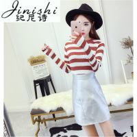 纪尼诗2018秋冬新款条纹针织手套上衣+时尚潮流银色洗水Pu裙套装