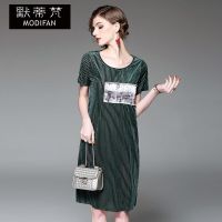 默蒂梵2017春夏新款女装欧美时尚丝绒拼接钉珠短袖连衣裙