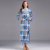 默蒂梵2017春季新款大码女装青花瓷印花长袖领口钉珠连衣裙开叉礼服长裙图片色